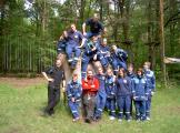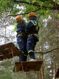 Während die "Großen" zur Einsatzübung nach Kleinmachnow fuhren, machten sich die Junghelfer des OV auf den Weg nach Strausberg, um dort im "Climb up!"-Kletterwald eine Teamübung zu absolvieren. Das Wetter war gnädig, und so konnten unter Leitung der Erlebnispädagogen Ingo Wolf und Georg Quandt verschiedene Teamübungen erfolgreich absolviert werden. Ziel war es, das Vertrauen innerhalb der Gruppe zu stärken und gemeinsam die gestellten Aufgaben zu lösen.