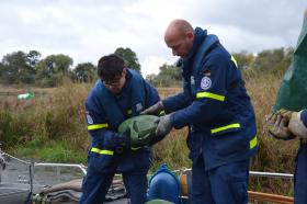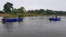 Die Fachgruppe Wassergefahren fährt einmal im Jahr zu einem fließenden Gewässer, um dort Fahrmanöver zu üben. Anders als auf dem Gewässer in und um Berlin sind in der Strömung besondere Manöver erforderlich. Insbesondere bei Anlegemanövern sind besondere Gefahren zu beachten. Um unter anderem dies zu üben, ging es für die Fachgruppe am ersten Oktoberwochenende an die Elbe. Wir waren zu Gast im Ortsverband Dessau. Für den Samstag hatte der Gruppenführer der Fachgruppe Wassergefahren André Kittelmann mit dem Zugführer Jan Krüger aus dem OV Dessau einige fiktive Einsatzaufträge vorbereitet. Unter dem Stichwort „Elbehochwasser 2016“ kam der erste Auftrag am Samstagmorgen. Die Fachgruppe und einige Helfer aus OV Dessau sollten Sandsäcke befüllen, auf Europaletten packen und auf dem Mehrzweckkraftwagen (MZKW) verlasten. Nachdem dies erledigt war, fuhr die Bergungsgruppe mit dem MzKW, dem Rettungssanitäterboot (RSB) aus Dessau und die Fachgruppe Wassergefahren mit dem Ladekran, dem Mehrzweckarbeitsboot (MzAB), dem Mehrzweckboot (MzB) und einem Mannschaftstransportwagen (MTW) zur Elbe, wo sie die Boote zu Wasser ließen und einsatzbereit ausrüsteten. Die Bergungsgruppe half die Sandsäcke auf den Booten zu verteilen und so wurde der Punkt „Fahren unter Last“ mit der Erkundungsfahrt verbunden. Ziel war eine Brücke einige Stromkilometer weiter, bei der die Bergungsgruppe schon wartete, um die Sandsäcke wieder entgegenzunehmen. Die Sandsäcke abgeladen, blieben die Helfer mit dem Booten in der Nähe der Brücke, um Anlegemanöver zu üben. Der Zugführer unterbrach die Gruppen auf den Booten mit der Funkdurchsage „Mensch über Bord“. Ein Helfer von OV Dessau, gekleidet mit einem Überlebensanzug, war in die Elbe gesprungen und wartete darauf, wieder aus dem Wasser gerettet zu werden. Die Helfer, gewohnt mit einer Puppe das Mensch-über-Bord-Manöver zu üben, fuhren zu der Person und retteten diese aus der Elbe