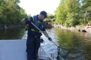 So machten wir uns also am Samstag, den 7.5.2016 gegen Mittag mit unserer Ausstattung auf den Weg vom Ortsverband zum Baumschulenweg, wo wir unsere zwei Boote, dem Mehrzweckboot (MzB) und dem Mehrzweckarbeitsboot (MzAB), in das Wasser kranten. An Bord vom MzAB hatten wir einen kleinen Metallkontainer festgezurrt, um den gesammelten Müll zu sammeln und sicher zu verstauen. Zudem waren wir mit Mülltüten, Keschern und speziellen Handschuhen ausgestattet. Das MzB diente als Sicherungsboot, dessen Besatzung dafür zuständig war, die Aktion im Auge zu behalten und zu reagieren falls bspw. jemand beim Aufsammeln des Mülls in das Wasser fällt.